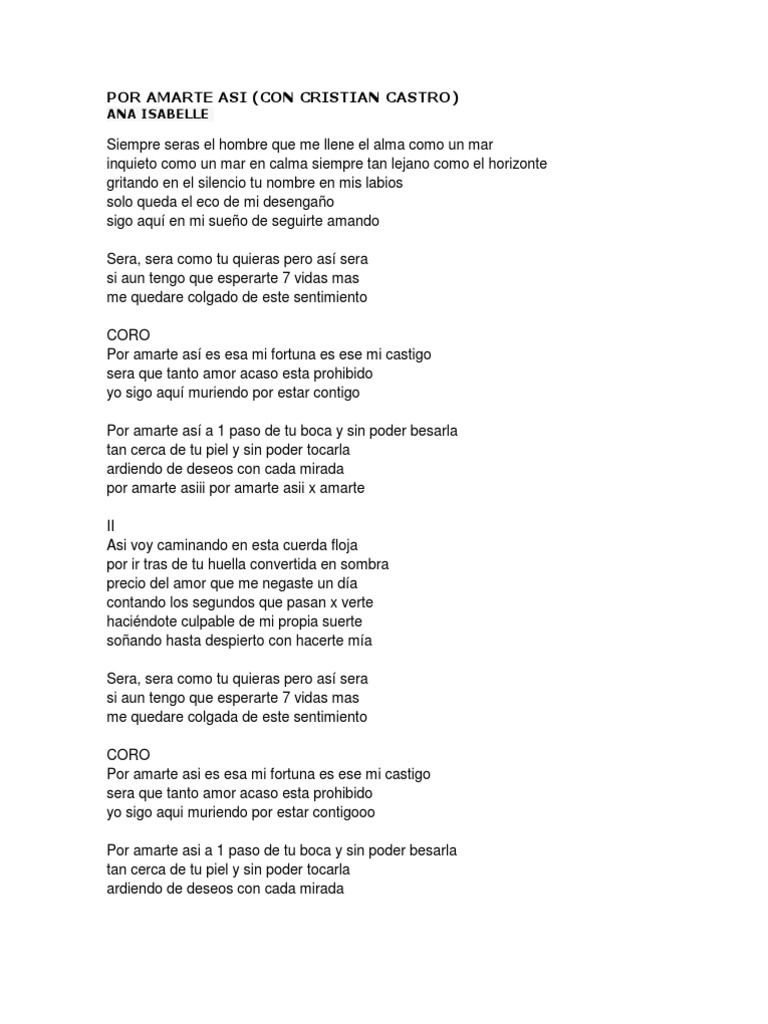 Letra De La Cancion Por Amarte Asi Christian Castro Ana Isabelle Cristian Castro Hablaba el conde lucanor con patronio y le dijo: